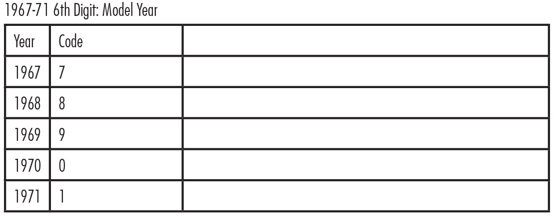 Body Style: For 1967-69 models, 37=Coupe and 67=Convertible; for 1970-71 models, 87=Coupe