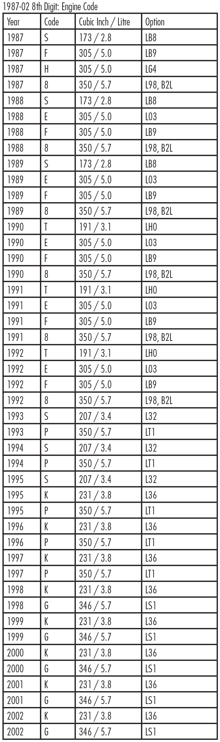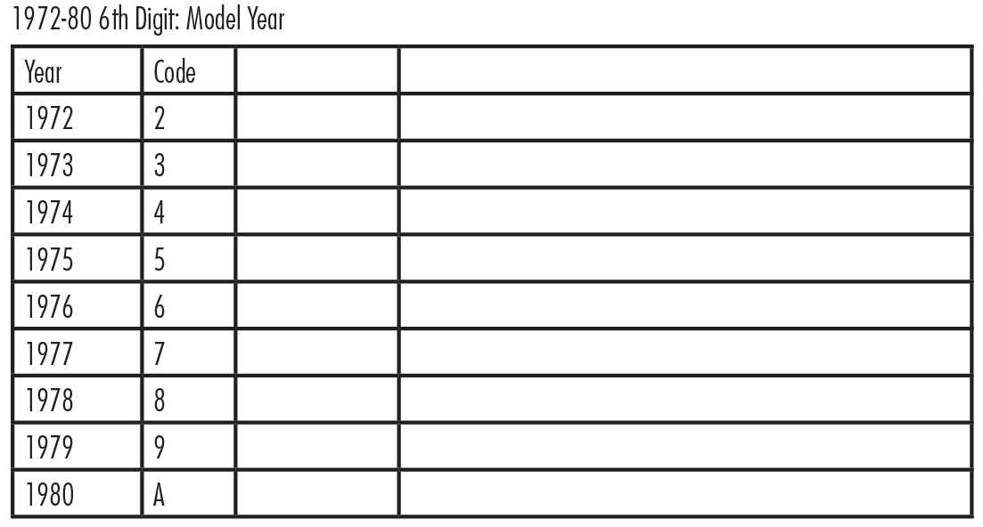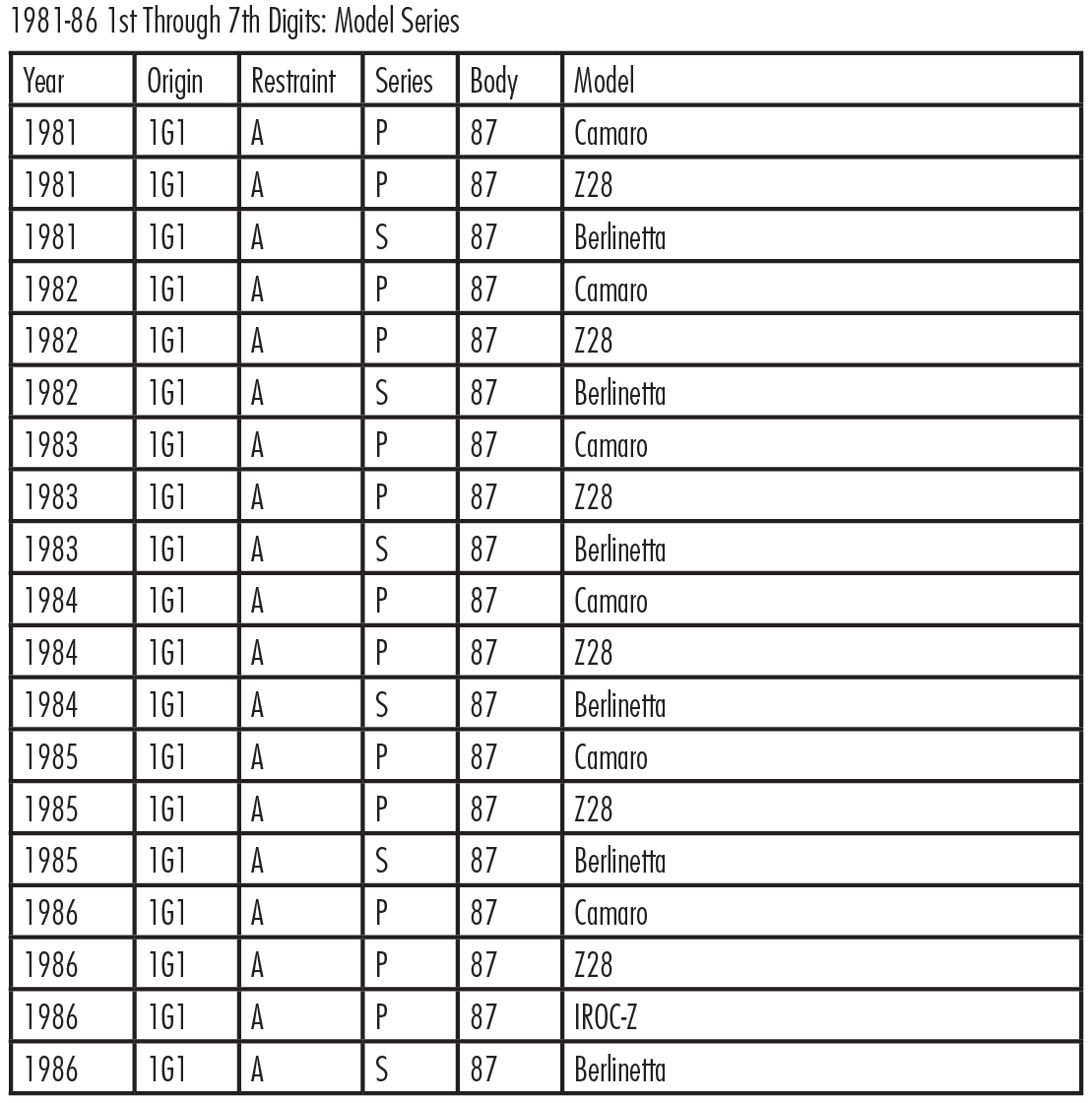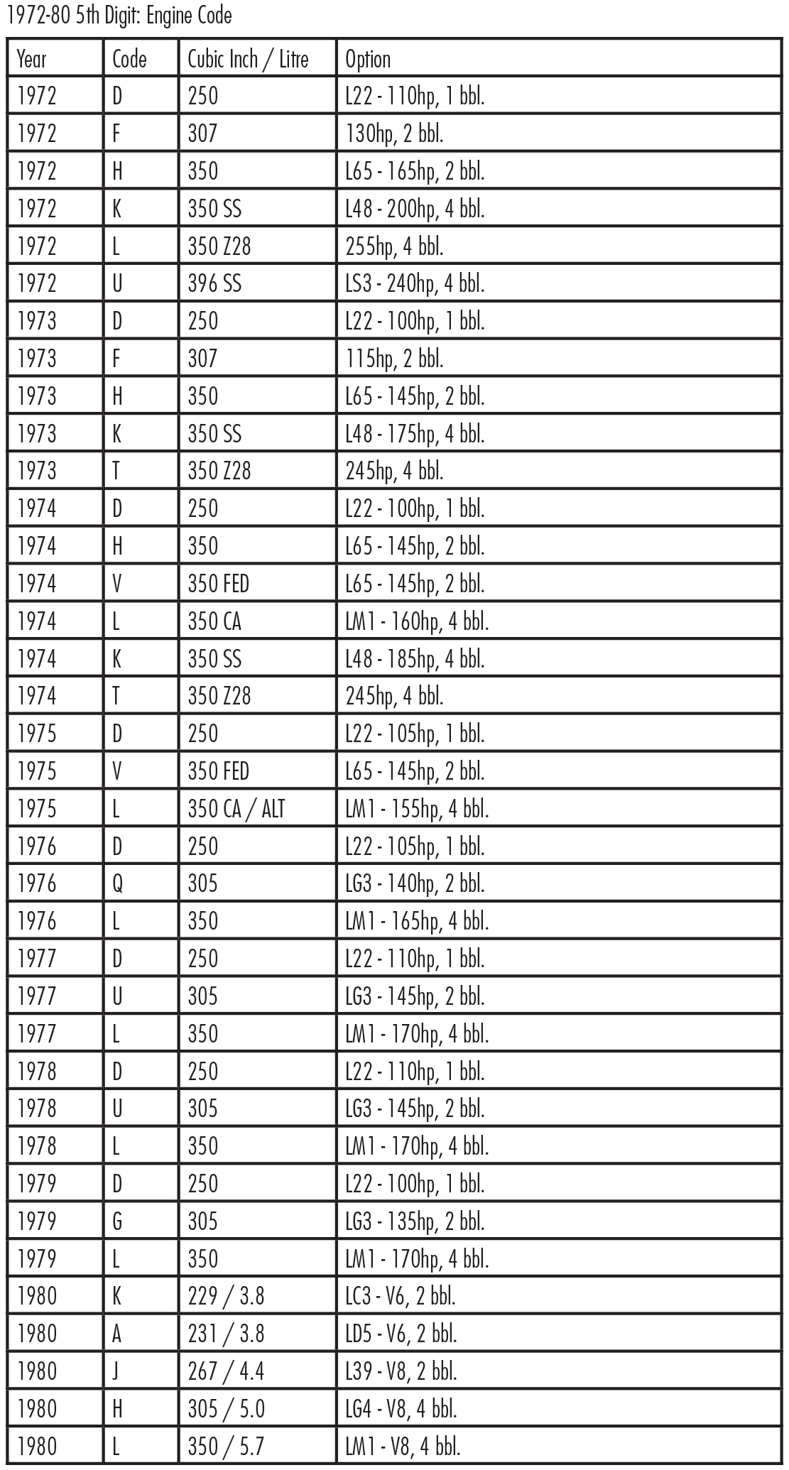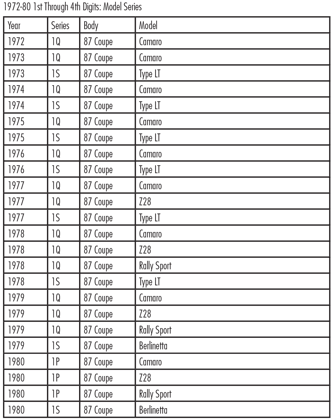 Series Model: Q=Camaro (1972-79), P=Camaro (1980), S=Type LT (73-78) or Berlinetta (79-80)