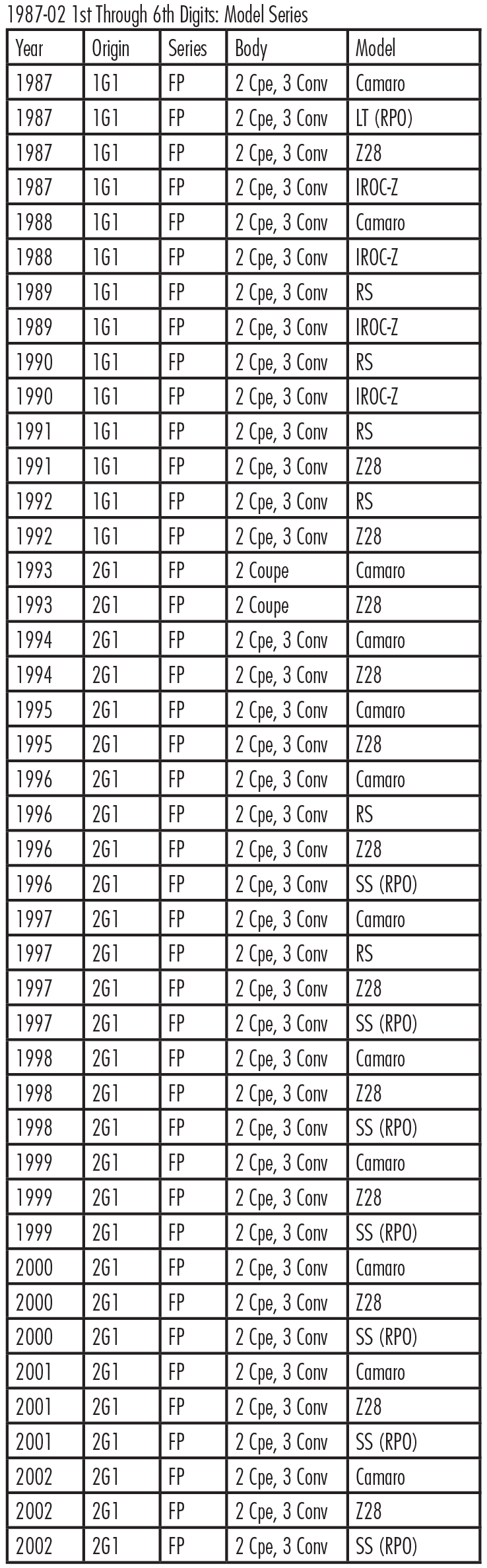 Model: P=Camaro Coupe or Z28, S=Berlinetta