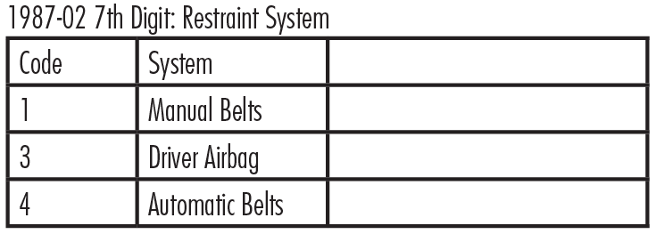 Restraint: 1=manual belts, 2=manual belts with built-in safety, 3=manual belts with driver's side airbag, 4=automatic belts