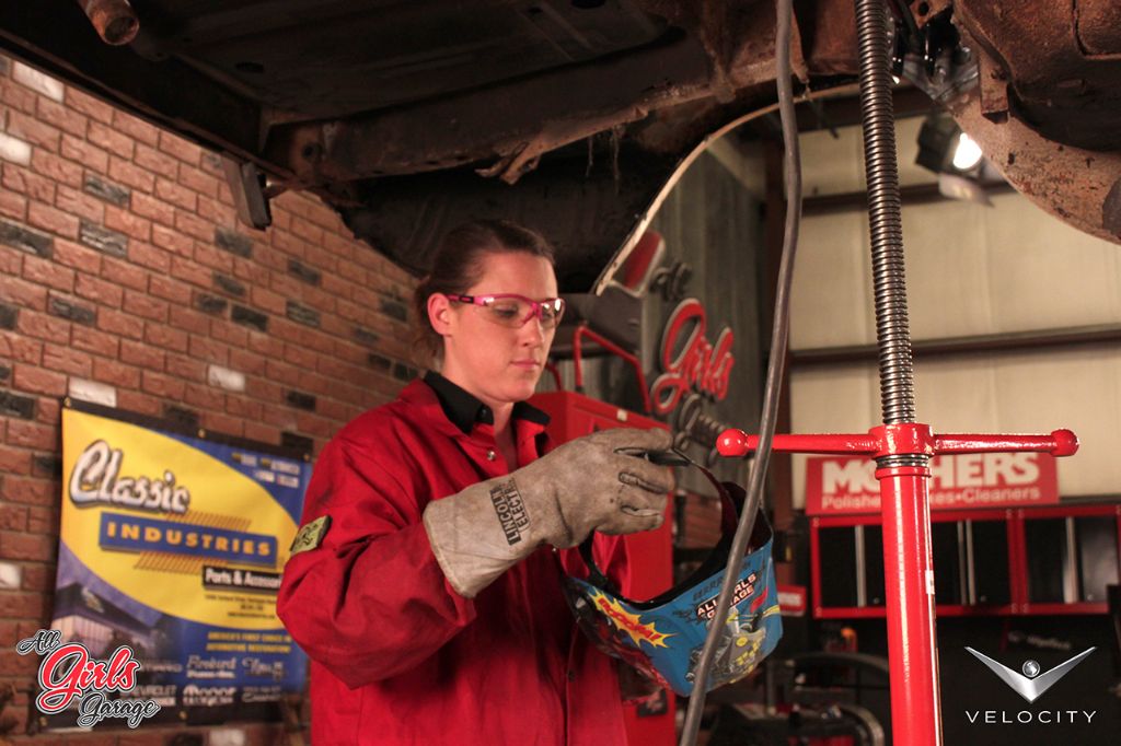 All Girls Garage member Bogi examines the ‘Cuda’s undercarriage. After cleaning out the dirt and rust, the car’s suspension, brakes, fuel tank, and more will be replaced with new parts from Classic Industries.