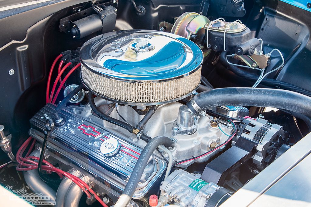 The exterior of the car has been painted in vibrant blue and crisp white. It rides on lowered suspension and chrome American Racing wheels that perfectly match the sparkling bumpers and trim.