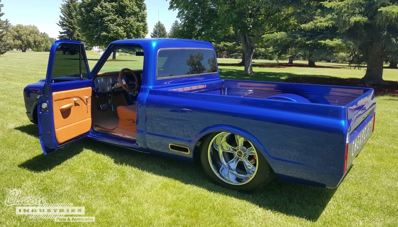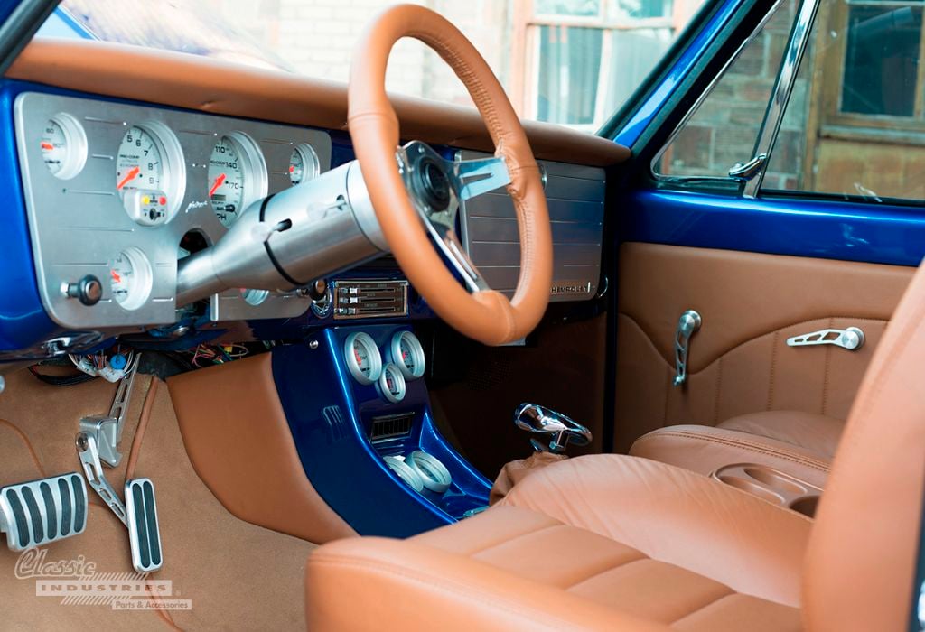 With the exception of the door handles, the body has been completely smoothed including removal of the cab drip rail and filling the factory gas cap, bed stakes, and side marker lamps. The 1969 hood was removed in favor of a '67/'68 hood. The box was tubbed with the bed floor raised 4 inches to accommodate the massive tires. The bed wood is hickory with stainless steel bed strips, all with hidden fasteners. The beautiful blue paint was laid down by Tom Valiquette of Tom's Classy Customs in Idaho Falls, ID. Tom also expertly handled all of the body work and fabrication for the project.