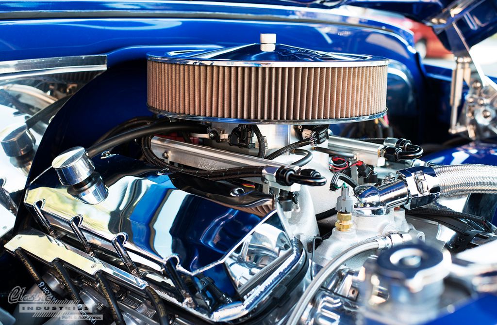 The engine, built by our company, Thunder Custom Auto, is a 572 cubic inch Merlin III big block with World Products Merlin CNC heads. The induction setup is a fuel injected Edelbrock intake topped by a Holley Dominator throttle body, all controlled by a Holley HP ECU. The engine is backed by a custom polished GM TH400 transmission. The exhaust system uses Dr. Gas boom tubes also found on NASCAR cup cars, exiting in front of the rear tires.