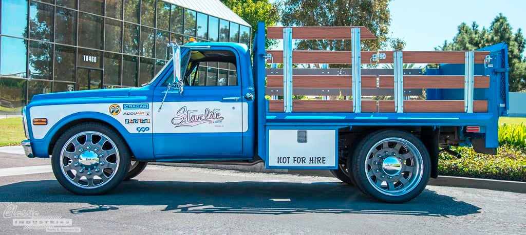 The remainder of the GMC truck was painted in a unique satin blue metallic, including the flatbed and rear lift gate. White accents with black pinstriping were layered on top, and finished off with the Starlite script logo on each door in eye-catching silverleaf. Finally, "Not for Hire" lettering was added, as well as several brand logos to show off the parts Edgar uses on his project cars. The GMC also features a variety of Classic Industries restoration parts, including the grill, hood emblem, billet dash panel, marker lights, and window seals.
